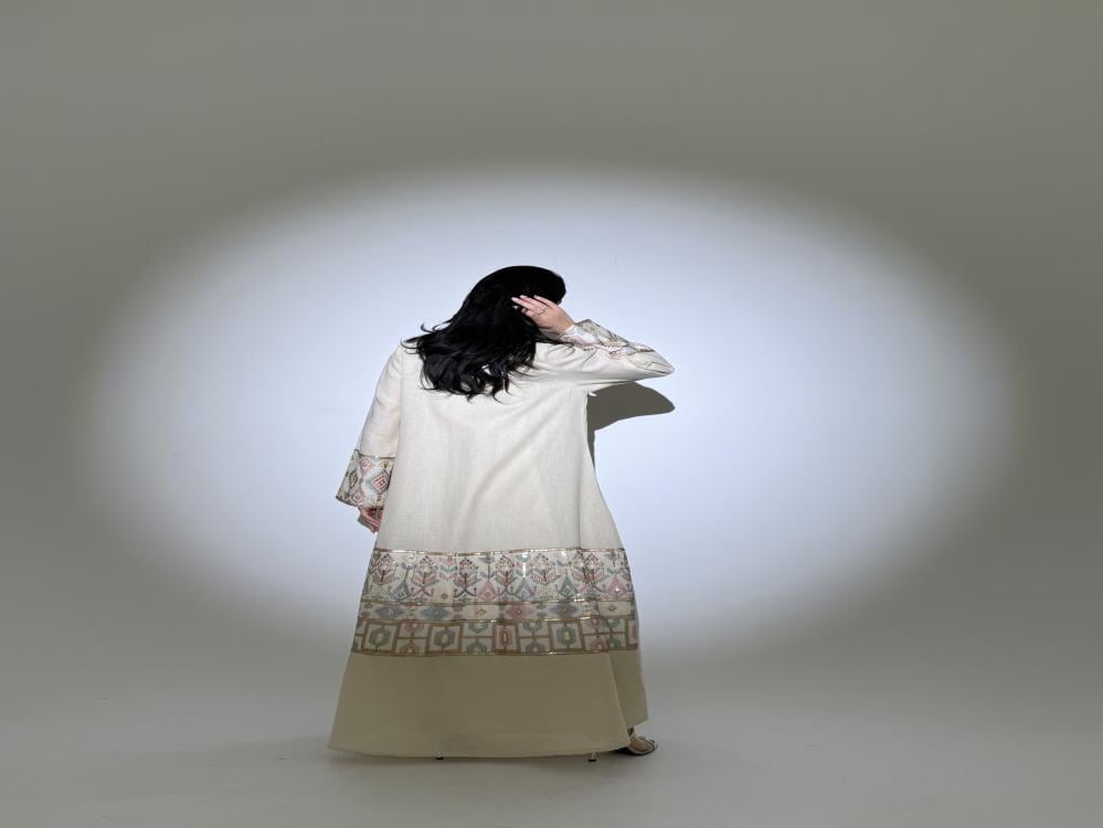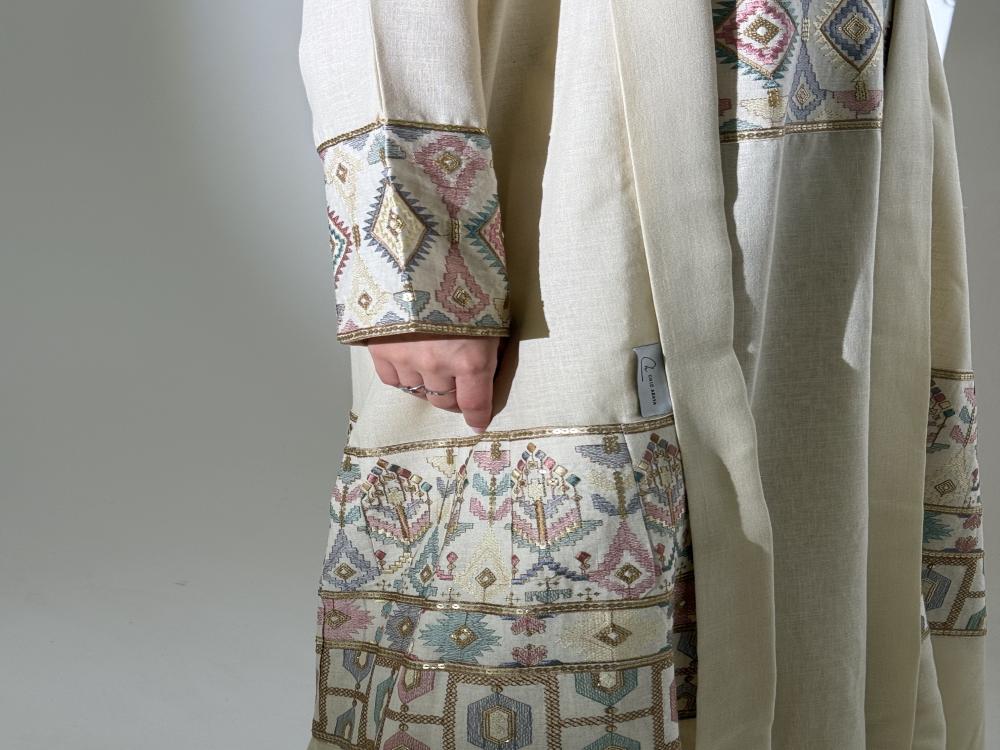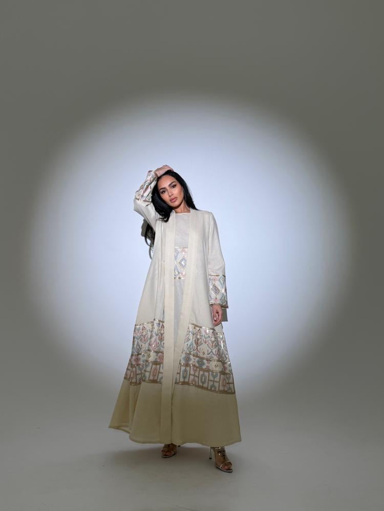 عبايه باللون البيج مع فستان مطرز