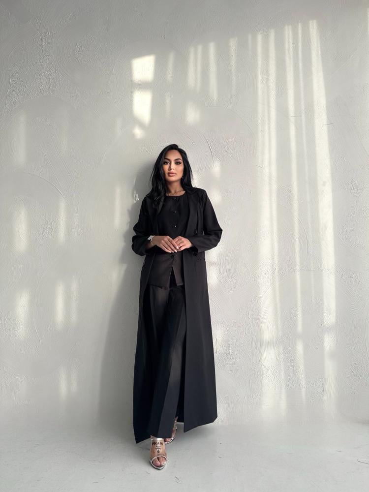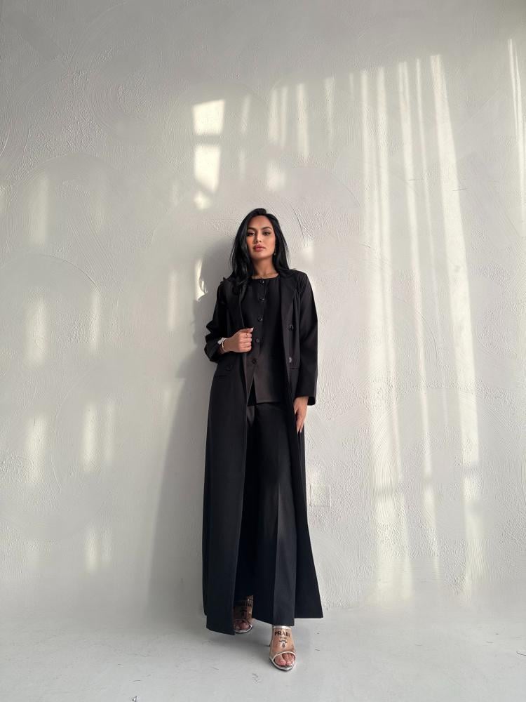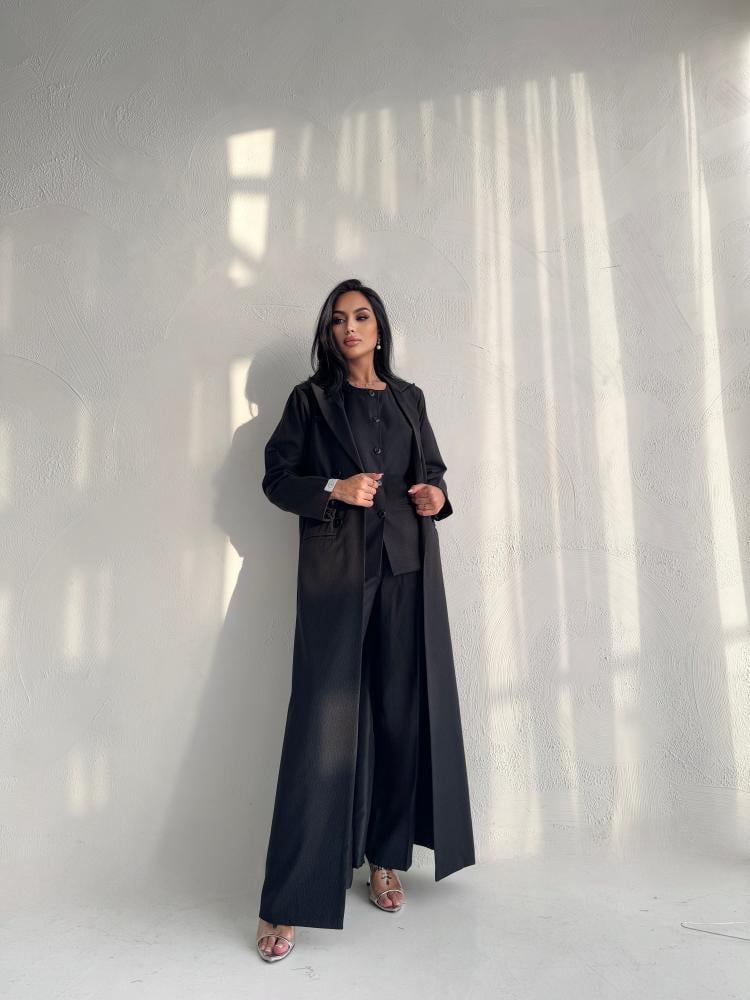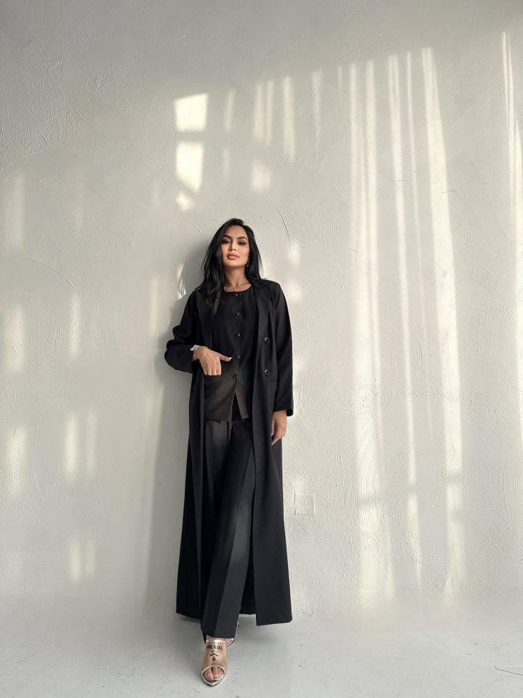 عبايه باللون الأسود بالقماش الكوري مبطنه طقم كامل عبايه وبلوزه وبنطلون وطرحه اكيد