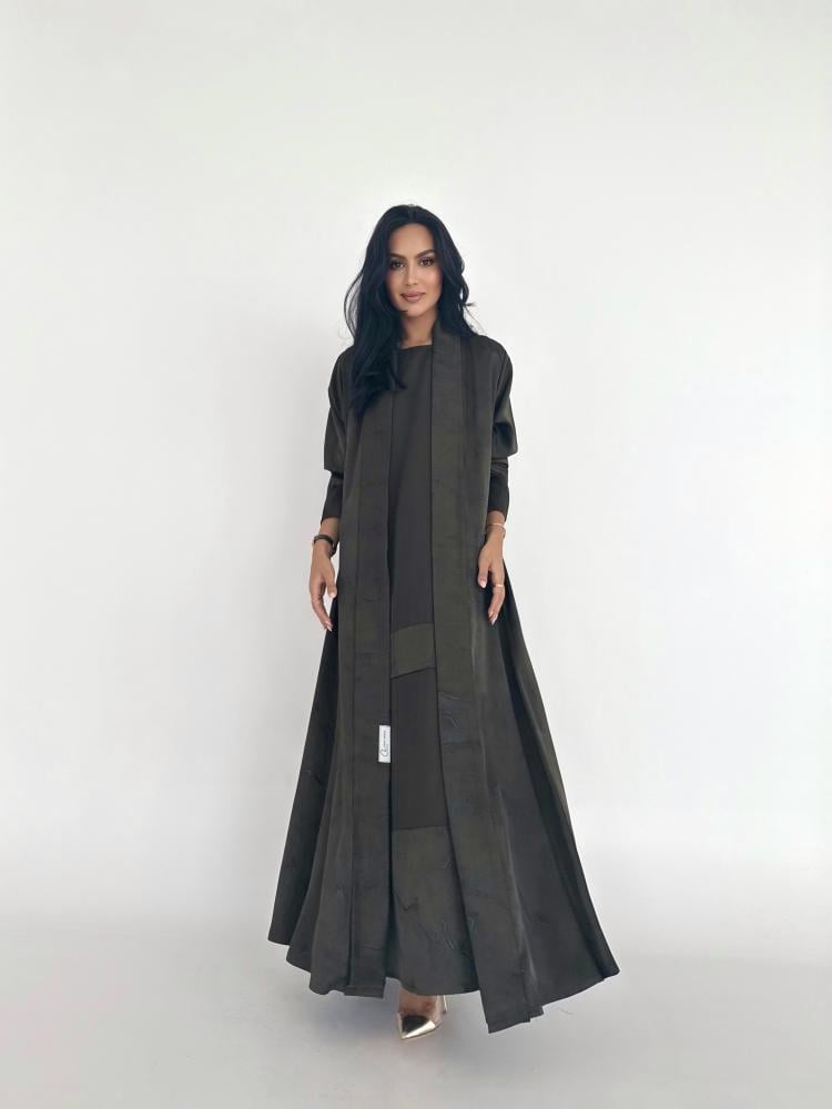 عبايه عشبي الزيتي مع فستان وطرحه اكيد نوع القماش الحرير الياباني مشجر بنفس اللون عشبي