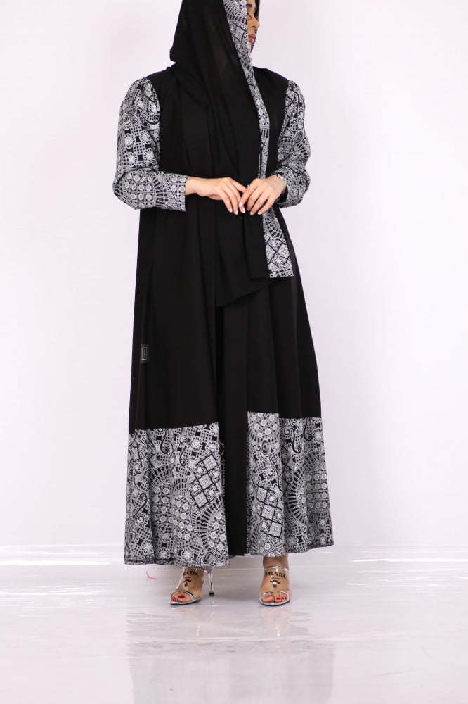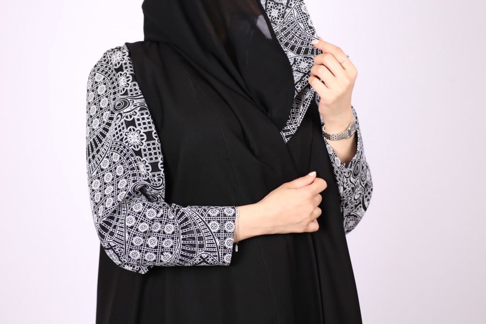 عبايه أسود بأكمام بف بتطويز أبيض